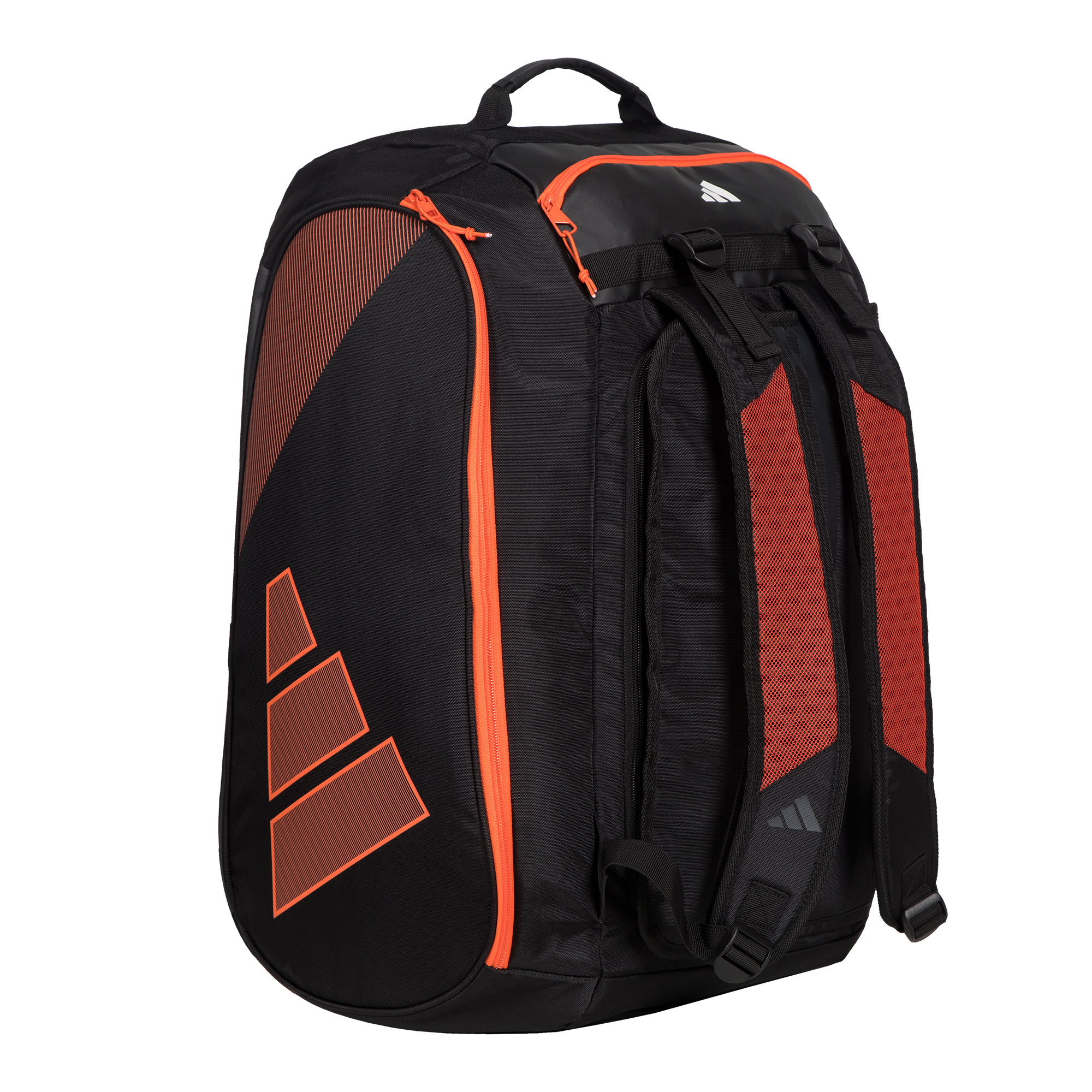 Raqueteira com grande compartimento central para guardar roupas e equipamentos esportivos. Dois bolsos laterais com isolamento térmico para proteger e armazenar duas raquetes por bolso. Um compartimento inferior com malha de ventilação para armazenar seu calçado de forma isolada. Um pequeno bolso na parte superior da bolsa de raquete para armazenar seus itens pessoais menores, como chaves, celular ou carteira. Alças acolchoadas e ajustáveis para carregar a raqueteira da maneira mais confortável.